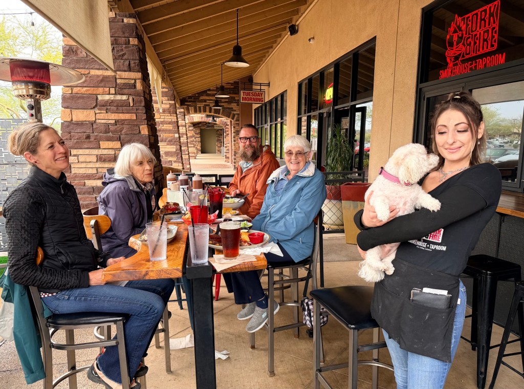 Some of Dad’s longtime friends from Colorado were visiting Tucson, and we met them for lunch on Christmas Eve. We hadn’t seen each other for several years, so there was a lot to catch up on — stories from the past, what life looks like now, and plenty of laughter in between. I stayed close, listened carefully (dogs are excellent listeners), and enjoyed being right in the middle of it all.